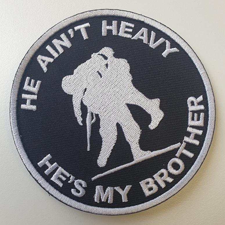 Op de badge staat de tekst "He ain't heavy, he's my brother"