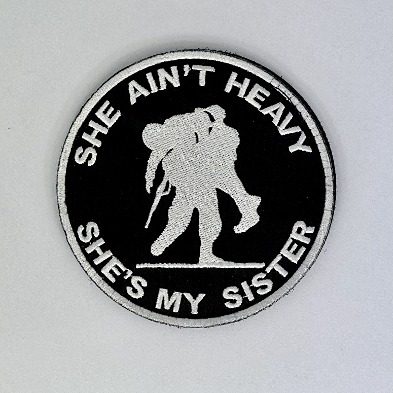 Op de badge staat de tekst "She ain't heavy, She's my sister"