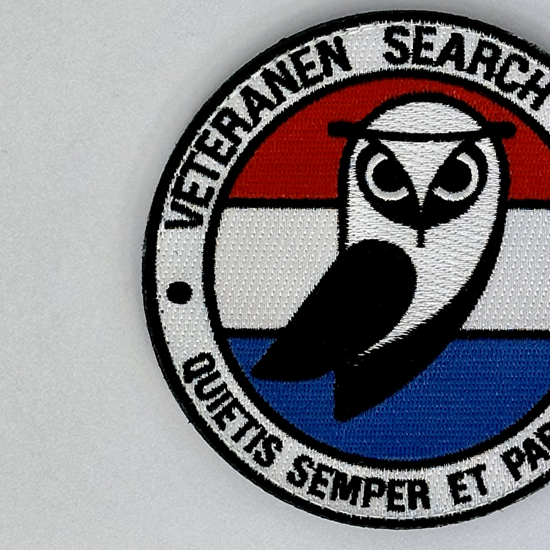 Ronde badge met logo van het Veteranen Search Team